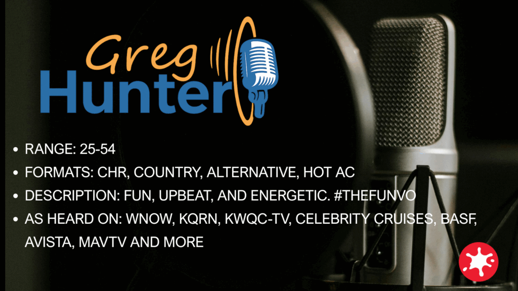 This time around, we’re featuring HUNTER. He’s a great high-energy and upbeat voice talent, and his work shines on CHR, Country, Hot AC. Listen to his demo at the bottom of the page. If you like what you hear, you can book Hunter here.