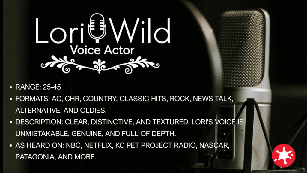 This time around, we’re featuring LORI WILD. Her voice is unmistakable, and she brings a distinct presence to her voiceover work. Listen to her demo at the bottom of the page. If you like what you hear, you can book Lori here.